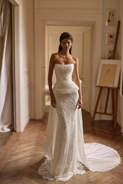 Cette robe sensuelle associe une dentelle délicate rehaussée de sequins scintillants, mettant en valeur une silhouette ajustée et féminine. Son corset structuré sculpte parfaitement le buste, tandis que le drapé doux qui retombe sur les épaules, noué au centre, apporte une touche vintage. Ce détail drapé est amovible pour un look plus épuré.